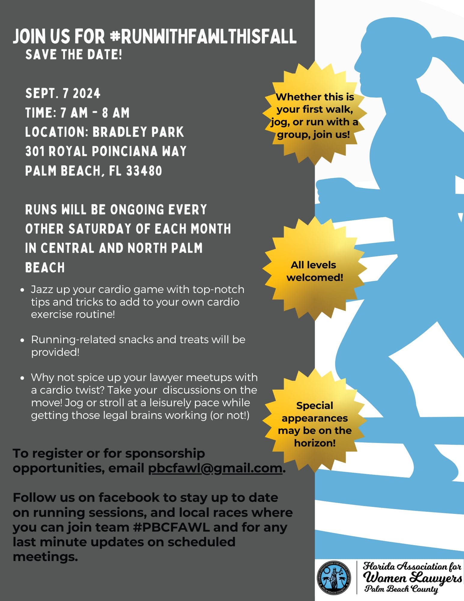 Follow us on facebook to stay up to date on running sessions, and local races where you can join team #PBCFAWL and for any last minute updates on scheduled meetings.